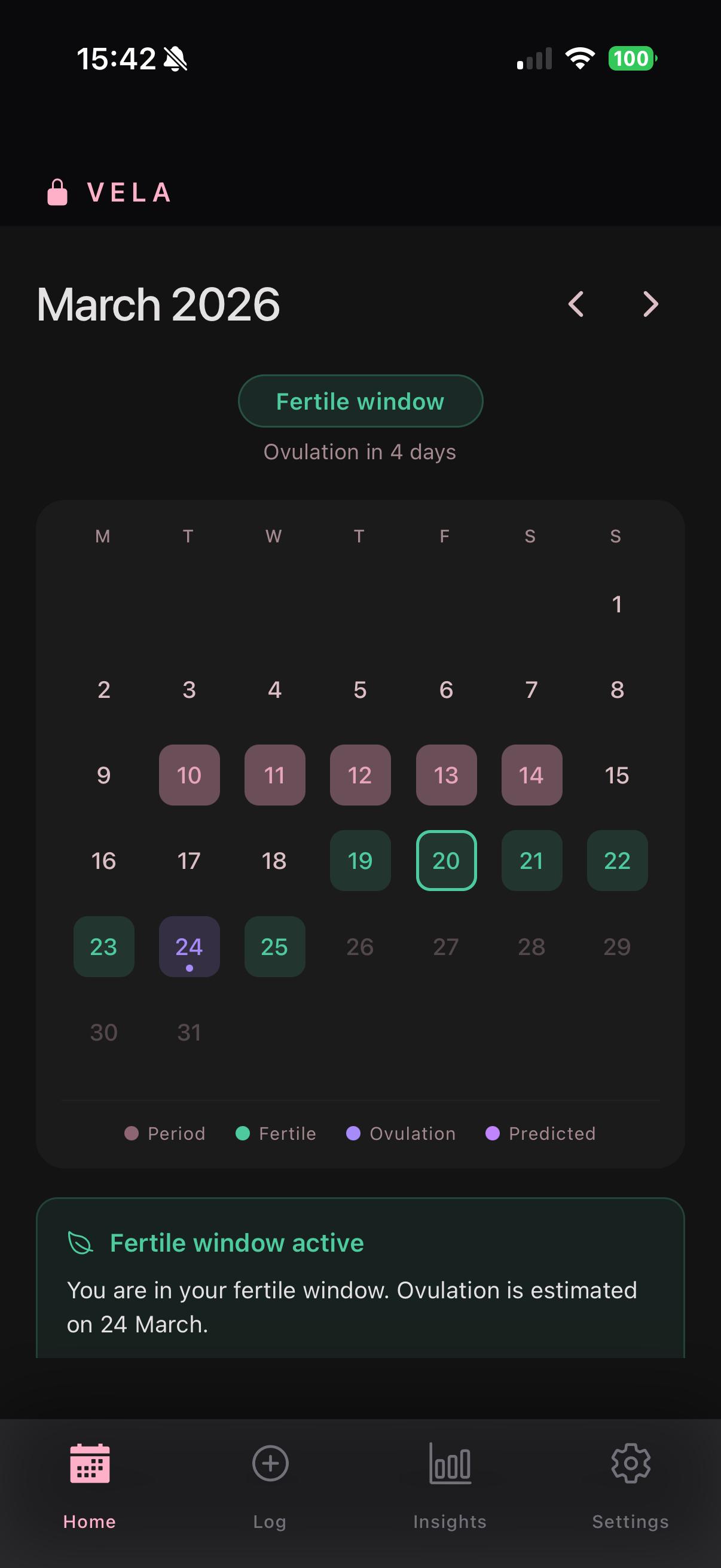 Vela tracks your cycle, predicts your period, and logs your symptoms — all on your phone. No account. No cloud. No one can see your data.