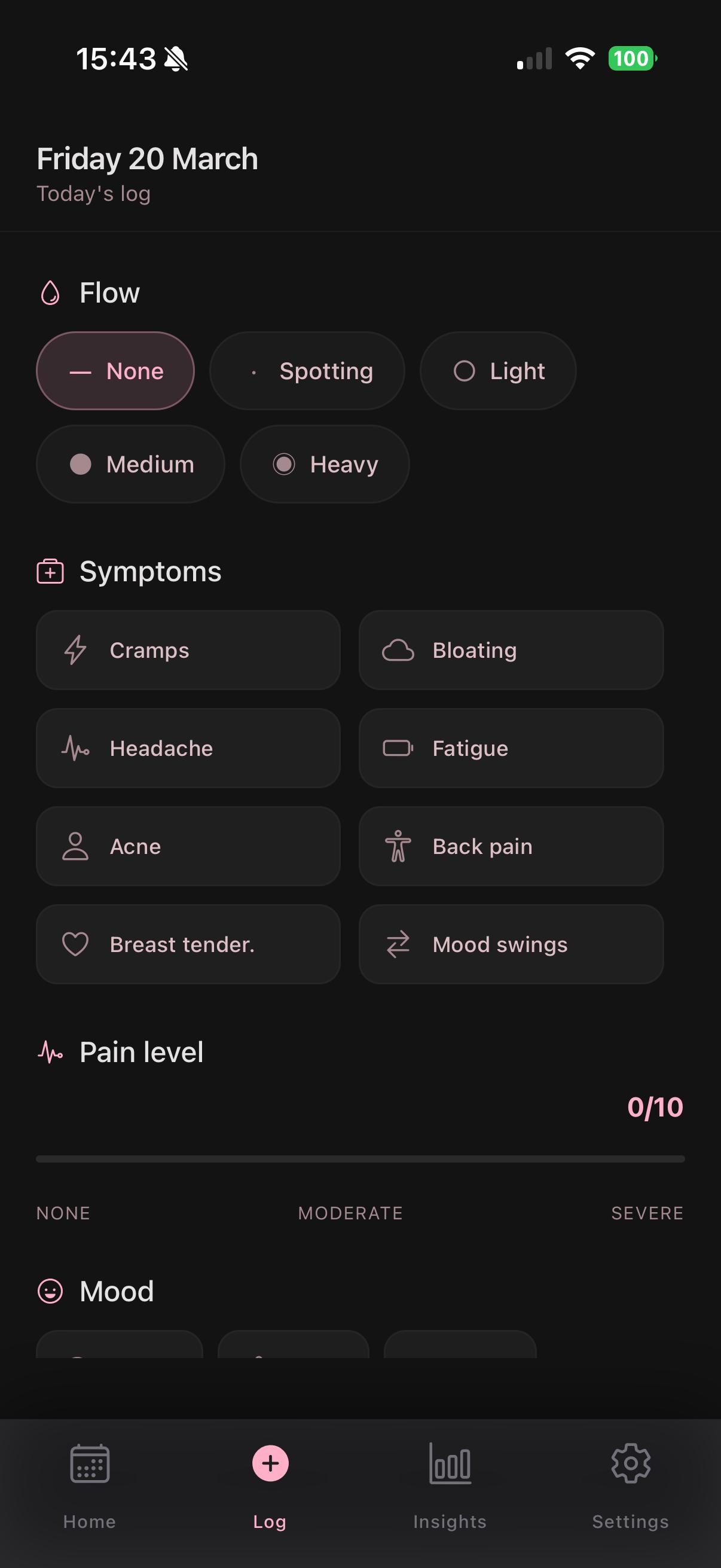 Log flow, symptoms, pain level, mood, and notes. Opens in one tap. Auto-saves when you close — no "save" button required.